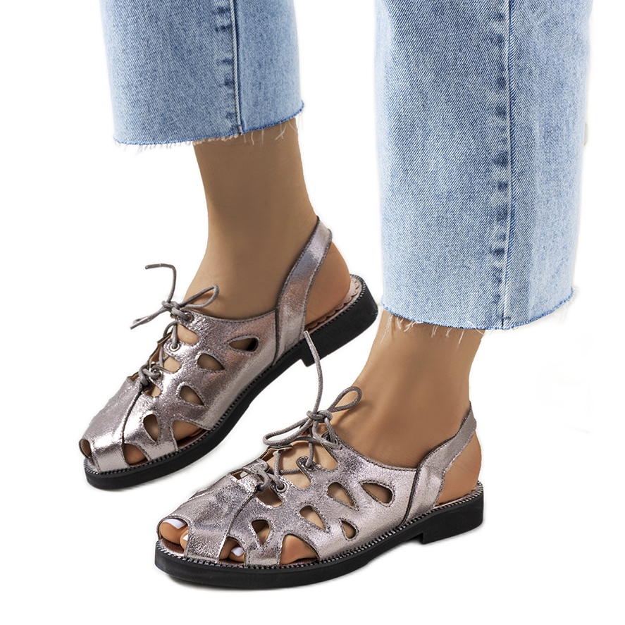 Eleganckie sandałki Vlis (model B27-1) w metalicznym odcieniu pewter to połączenie klasycznej formy z nowoczesnym wykończeniem. Wykonane z wysokiej jakości skóry ekologicznej zarówno na zewnątrz, jak i wewnątrz, zapewniają wygodę użytkowania i estetyczny, subtelny połysk. Ażurowe detale oraz wiązanie pozwalają idealnie dopasować cholewkę do stopy, a płaski obcas o wysokości 2,5 cm gwarantuje stabilność przez cały dzień.