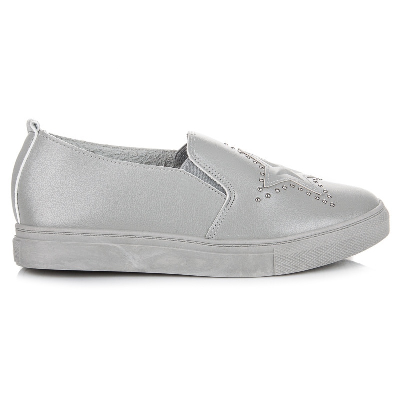 Wysokość platformy wynosząca 2 cm oraz brak obcasa zapewniają doskonałą amortyzację, co przekłada się na komfort nawet przy dłuższym noszeniu. Szare slipony z gwiazdą to must-have w każdej kobiecej garderobie – połączenie stylu, wygody i funkcjonalności!