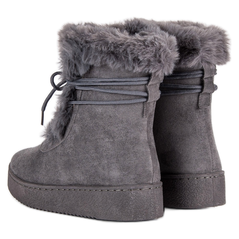 Płaska podeszwa z bieżnikiem zapewnia doskonałą przyczepność nawet na śliskiej nawierzchni, co czyni je niezastąpionym towarzyszem podczas zimowych spacerów. Wnętrze butów ocieplone jest przyjemnym futerkiem, które nie tylko chroni przed zimnem, ale również dodaje stylowego wyglądu. Szary kolor jest uniwersalny i doskonale komponuje się z jesienno-zimową garderobą, a futerko, które wystaje na cholewce, nadaje całości eleganckiego charakteru.