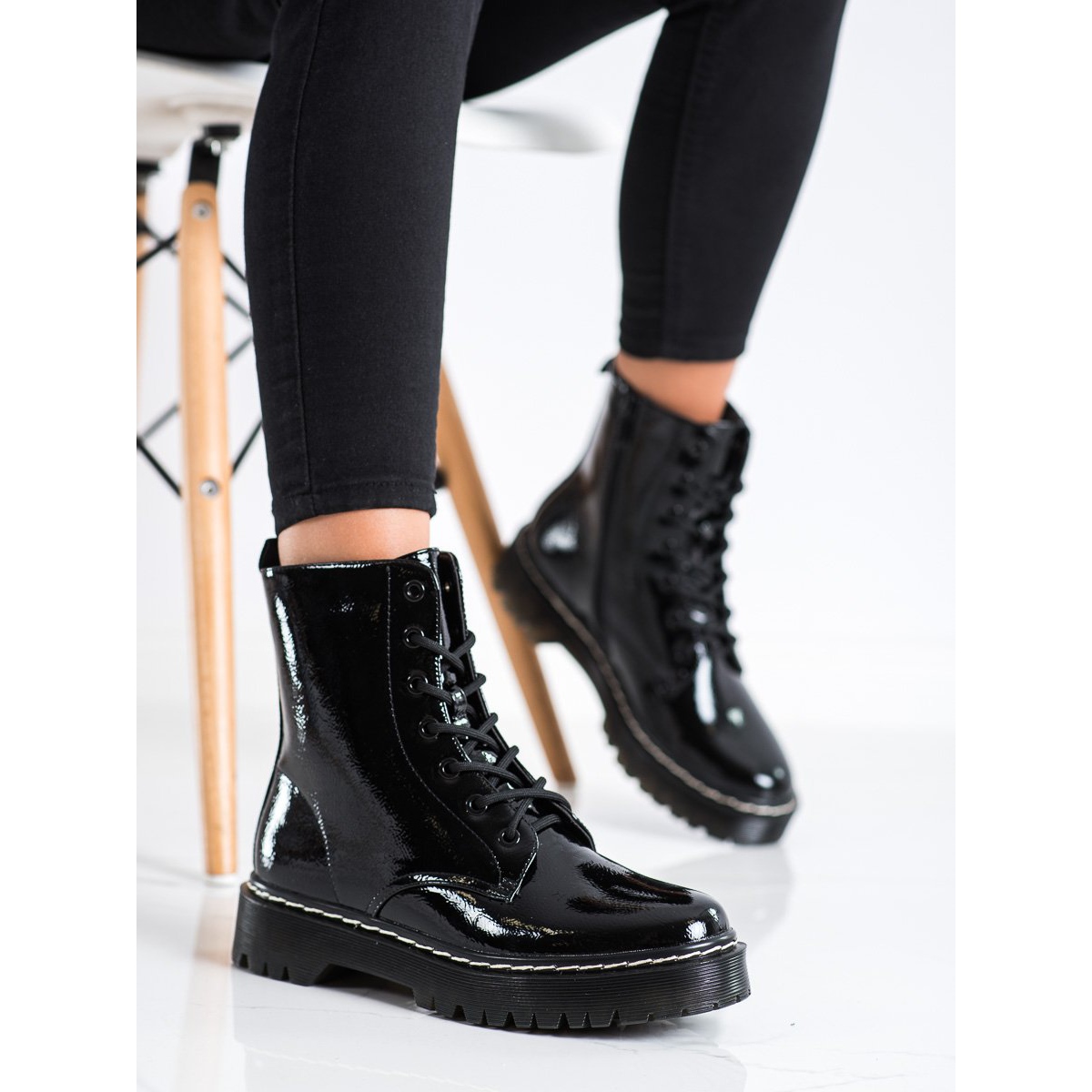 Platforma o wysokości 3,5 cm i płaski obcas pozwalają na wygodne poruszanie się przez cały dzień. Dodatkowo, praktyczne zapięcie na zamek oraz sznurowane wiązanie ułatwiają zakładanie i dopasowanie do stopy. Wysokość cholewki wynosząca 15 cm pięknie modeluje nogi, a lakierowane wykończenie dodaje im wyjątkowego blasku.