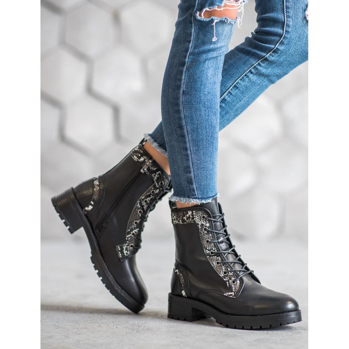 Odkryj modne i wygodne botki damskie Seastar Sznurowane Workery Snake Print w klasycznym odcieniu czerni, które idealnie wpisują się w aktualne trendy. Te wyjątkowe botki za kostkę nie tylko zachwycają swoim designem, ale także zapewniają komfort noszenia i ochronę przed niekorzystnymi warunkami pogodowymi.
