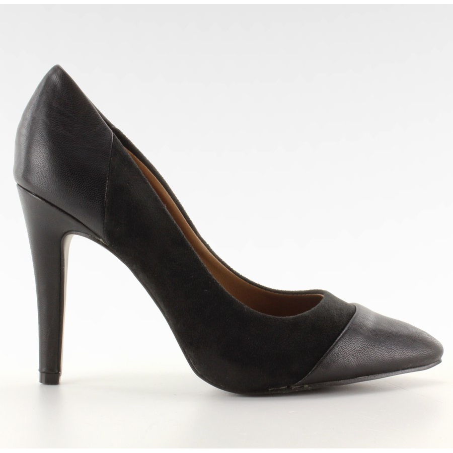 Szpilki klasyczne E364 — eleganckie czółenka w ponadczasowej czerni, łączące dwa wykończenia: delikatny ekozamsz i gładką, ekologiczną skórę licową. Smukły, szpiczasty nosek i wysoka szpilka (11 cm) wysmuklają sylwetkę, nadając stylizacji szyku — idealne zarówno na wieczorne wyjścia, jak i do podkreślenia codziennego, eleganckiego looku.