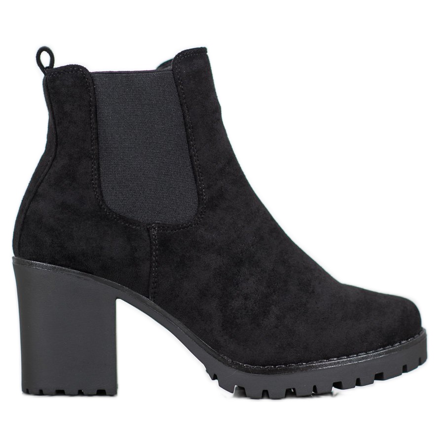 Buty w kolorze ponadczasowej czerni zostały wykonane z wysokogatunkowego skóry ekologicznej zamszowej, która nie tylko świetnie wygląda, ale i jest trwała. Cholewka na niskiej platformie z porządnym bieżnikiem zapewnia pewny krok bez względu na warunki pogodowe czy teren. Dodatkowym atutem jest wysoki na 7,5 cm gruby obcas typu słupek, który optycznie wydłuża nogę, a jednocześnie gwarantuje stabilność i komfort użytkowania.