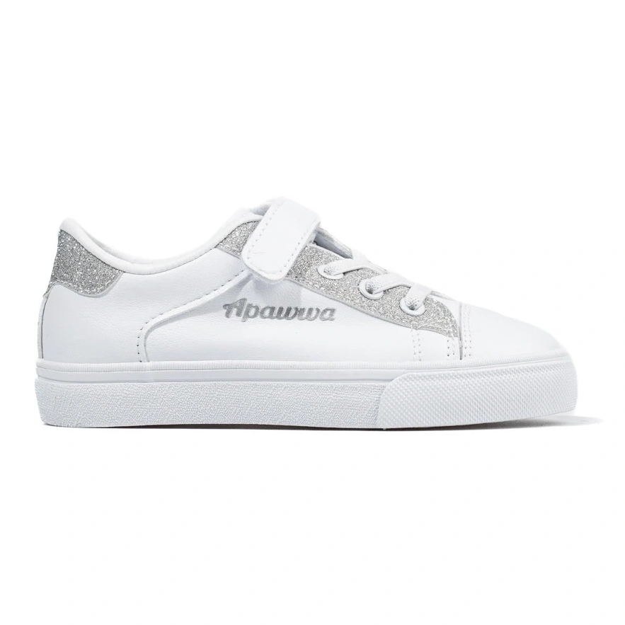 Stylowe i wygodne trampki dla dziewczynek łączące sportowy charakter z błyszczącym akcentem. Białe z srebrnym brokatem, na praktycznych rzepach — idealne do szkoły, przedszkola i na co dzień.