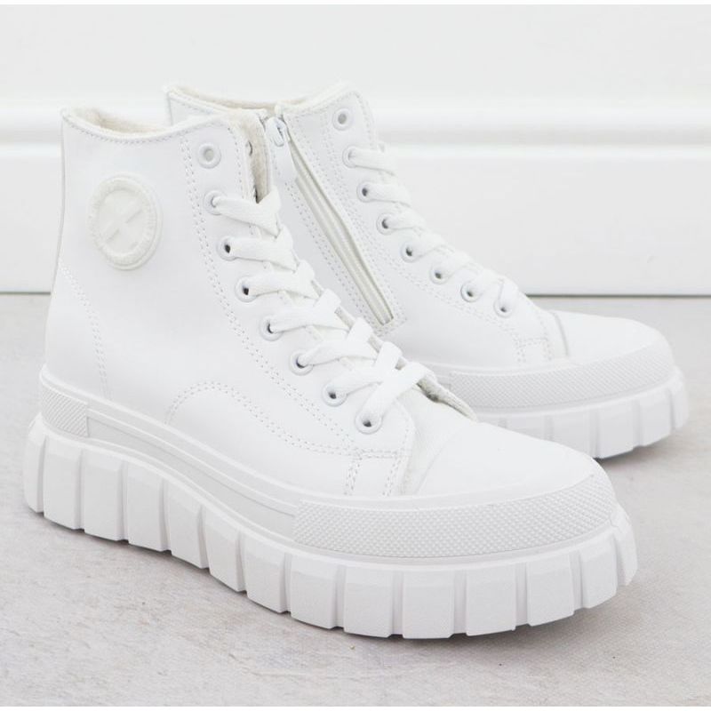 Co wyróżnia ten model? Trampki są ocieplane, a ich wyściółka oraz wkładka są pokryte przyjemnym w dotyku futerkiem, co sprawia, że noszenie ich to prawdziwa przyjemność, zwłaszcza w chłodniejsze dni. Białe trampki na platformie idealnie komponują się z różnorodnymi stylizacjami – od casualowych po bardziej eleganckie, co czyni je wszechstronnym dodatkiem w każdej kobiecej garderobie.