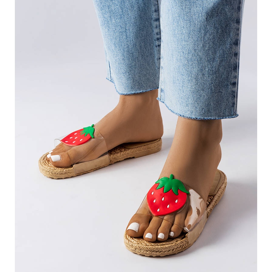 Cechą wyróżniającą te klapki jest subtelna ozdoba w kształcie urokliwej truskawki, która dodaje im charakteru oraz sprawia, że każdy krok staje się modowym akcentem. Klapki podkreślają letni klimat, łącząc bezbarwną przezroczystość z energicznym czerwonym akcentem.