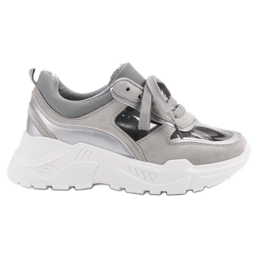 Transparentne sneakersy w kolorze szarym to must-have w każdej wiosenno-letniej garderobie. Te stylowe buty wyróżniają się 5,5-centymetrową platformą, która nie tylko zapewnia wygodę, ale także optycznie wydłuża nogi, dodając Ci atrakcyjnej wysokości. Ich design wpisuje się w najnowsze trendy, dzięki czemu doskonale uzupełnią różnorodne stylizacje – od casualowych po bardziej eleganckie.