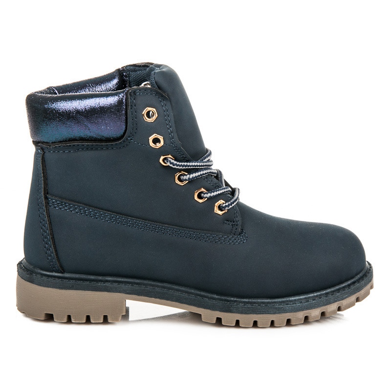 Via Giulia — niebieskie traperki dziewczęce idealne na chłodniejsze dni. Stylowy, a jednocześnie praktyczny model na sezon jesień/zima — wykonany ze skóry ekologicznej, na grubej gumowej podeszwie z bieżnikiem, zapewniającej dobrą przyczepność. Sznurowane, sięgające ponad kostkę, ze stabilnym, zabudowanym zapiętkiem i tekstylnym ociepleniem — wygodne i ciepłe przy codziennym użytkowaniu.