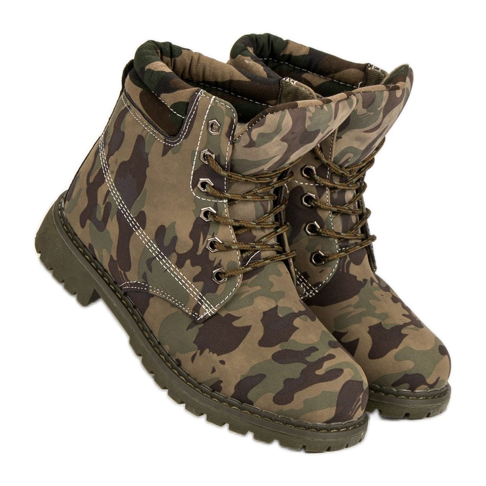Dzięki zapięciu na sznurowadła, traperki doskonale dopasowują się do stopy, gwarantując stabilność podczas chodzenia. Wysokość za kostkę oraz ocieplenie sprawiają, że są idealnym wyborem na chłodniejsze dni, zapewniając ciepło i wygodę. Zielony kolor z modnym wzorem moro nadaje im wyjątkowego charakteru, dzięki czemu doskonale komponują się z wieloma stylizacjami - zarówno casualowymi, jak i bardziej wyszukanymi.
