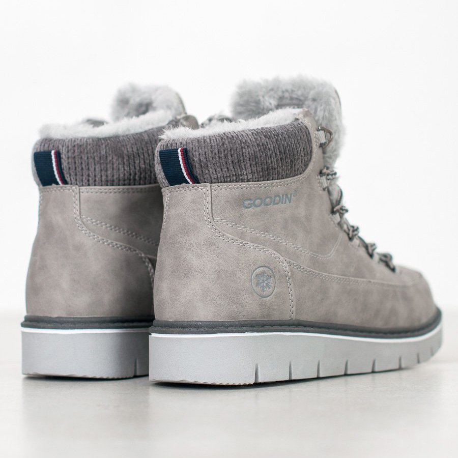 Traperki na platformie Goodin w kolorze szarym to idealna propozycja dla kobiet ceniących wygodę i styl w jednym. Wykonane z zamszowej skóry ekologicznej, te buty są doskonałym wyborem dla wegan i wegetarian. Oferują nie tylko atrakcyjny wygląd, ale także komfort noszenia dzięki miękkiej, zaoblonej cholewce, która sięga za kostkę.