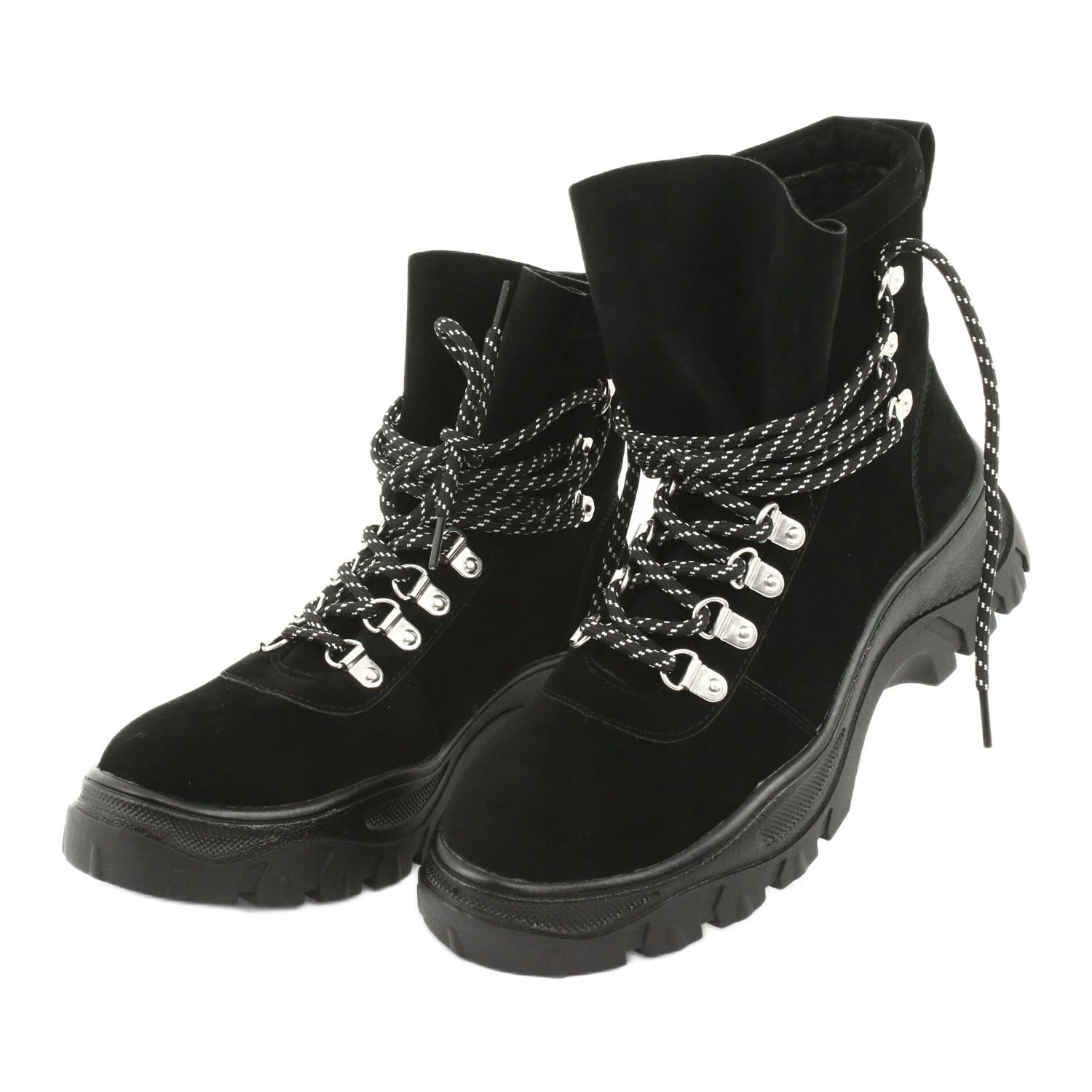 Stabilna, sztywna pięta oraz grubsza podeszwa (o wysokości 4,5 cm) stanowią dodatkową izolację przed chłodem i zwiększają komfort w trakcie długich spacerów. Czarne wzornictwo bez dodatkowych wzorów sprawia, że te traperki pasują do różnych stylizacji, a ich uniwersalny kolor sprawia, że bez trudu zestawisz je z wieloma ubraniami.
