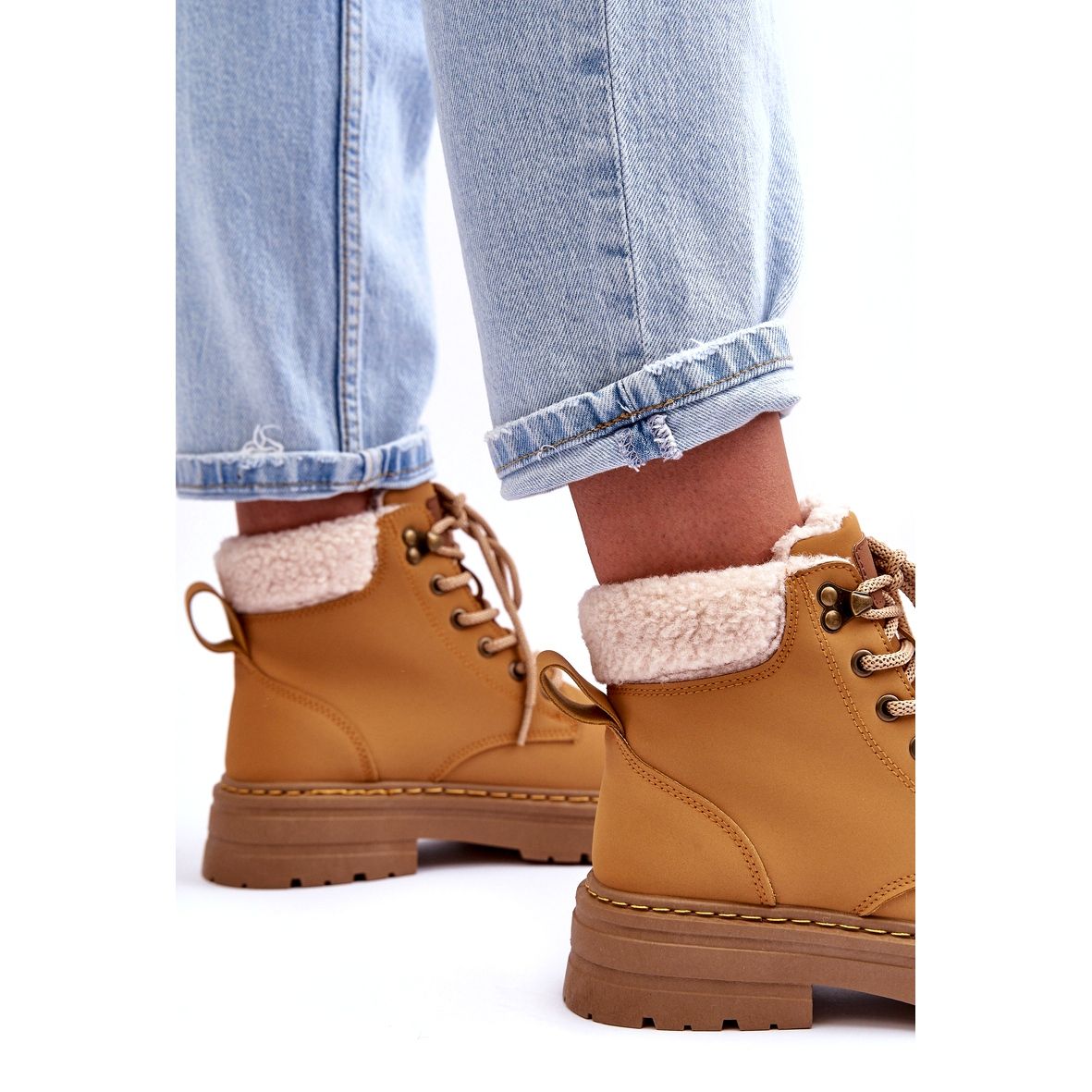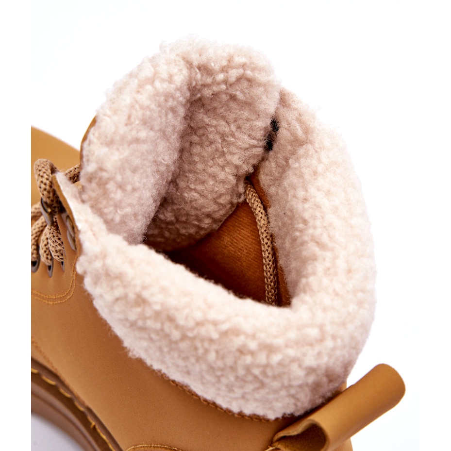 Stylowe trapery wykonane ze skóry ekologicznej w ciepłym odcieniu camel z beżowymi akcentami. Model sznurowany, o zaokrąglonym nosku, osadzony na stabilnej platformie z płaskim obcasem (wys. 4 cm). Cholewka sięga za kostkę; na górze cholewki i od wewnętrznej strony języka zastosowano przyjemny kożuch, a wnętrze ocieplono kocem obuwniczym — idealne na chłodniejsze dni.