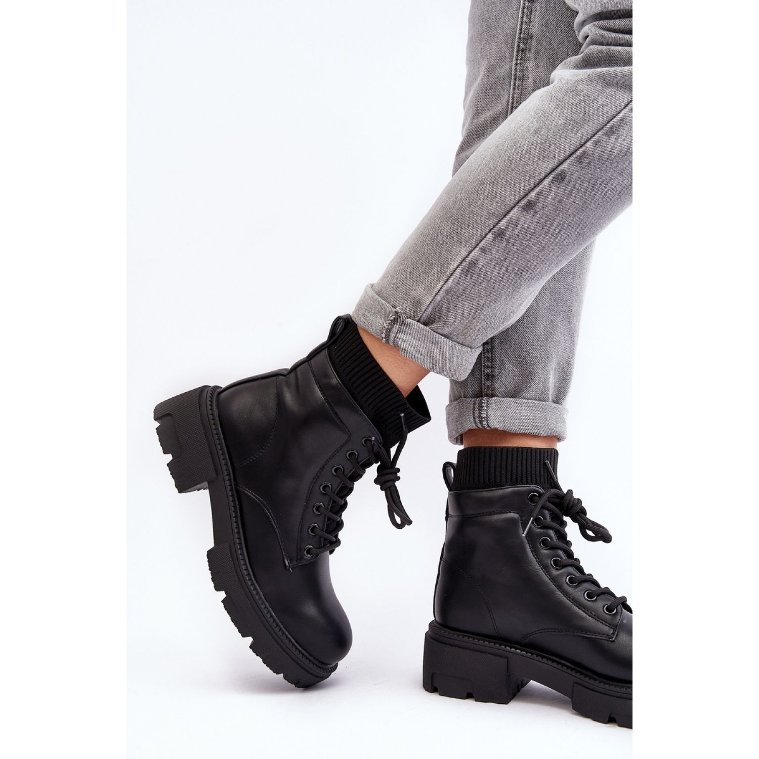 Trapery osadzone są na solidnym, płaskim obcasie o wysokości 5 cm oraz platformie wynoszącej 3 cm, co zapewnia stabilność i komfort w każdych warunkach. Z cholewką sięgającą 15 cm, model ten doskonale chroni kostki, a wsuwany fason z klasycznym sznurowaniem z przodu dodaje im charakteru. Zaokrąglone noski i usztywniony zapiętek podkreślają nie tylko modny wygląd, ale także wygodę noszenia.