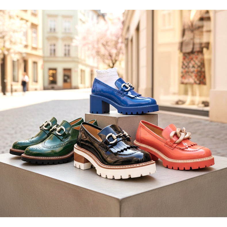 Loafersy utrzymują silna pozycję w trendach obuwniczych 2026. W tym sezonie dominują modele o nieco bardziej awangardowym charakterze — loafersy z grubbą kontrastową podeszwą, modele z cłęciem i zdobieniami przy nosic, a także lakierowane warianty w odważnych kolorach, jak chaber, butelkowa zielen czy koralowy.