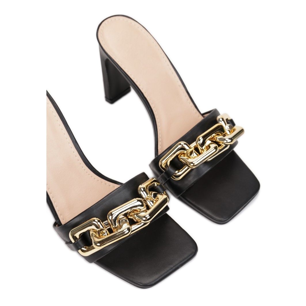 Przedstawiamy klapki na obcasie Vices 1C-38 w eleganckim czarnym kolorze, które z pewnością zachwycą każdą miłośniczkę mody. Ich klasyczny design został uzupełniony nowoczesnym akcentem – złotym łańcuchem ozdabiającym szeroki pasek. Klapki mają obcas o wysokości 9,5 cm, co dodaje smukłości sylwetce, a jednocześnie zapewnia wygodę noszenia dzięki wsuwanej konstrukcji.
