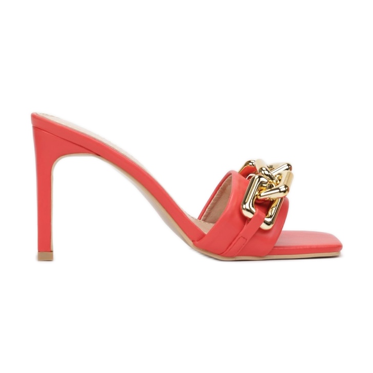 Klapki wsuwane, z kwadratowym noskiem, charakteryzują się szerokim paskiem, który krzyżuje się między palcami a śródstopiem. Ozdobione złotym łańcuchem, dodają szyku i przyciągają wzrok. Wykonane z wysokiej jakości ekoskóry, zapewniają nie tylko estetyczny wygląd, ale także trwałość i łatwość w pielęgnacji.