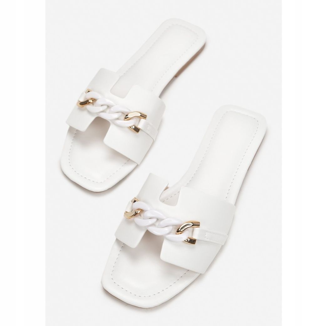 Klapki Vices 2136-71 w eleganckim białym kolorze to idealny wybór dla każdej kobiety, która szuka wygody i stylu na co dzień. Te wsuwane klapki charakteryzują się odkrytym kwadratowym noskiem, co dodaje im nowoczesnego wyrazu. Szeroki pasek przy palcach, ozdobiony efektownym łańcuchem w dopasowanym kolorze, dodaje charakteru oraz sprawia, że klapki są nie tylko komfortowe, ale i modne.