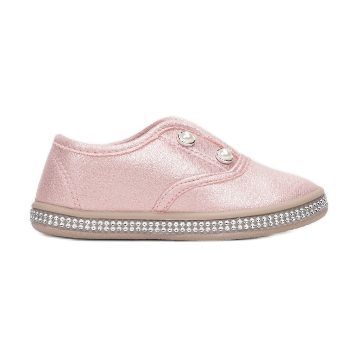 Front tenisówek został zaprojektowany z szeroką, elastyczną gumą, co ułatwia ich zakładanie i zapewnia wygodne dopasowanie do stopy. Dodatkowo, na wierzchu znajdują się wstawki z imitacji pereł, które nadają obuwiu subtelności i dziewczęcego uroku. Okrągły nosek sprawia, że buty są komfortowe i dostosowane do naturalnego kształtu stopy, co zwiększa ich funkcjonalność.