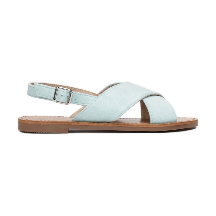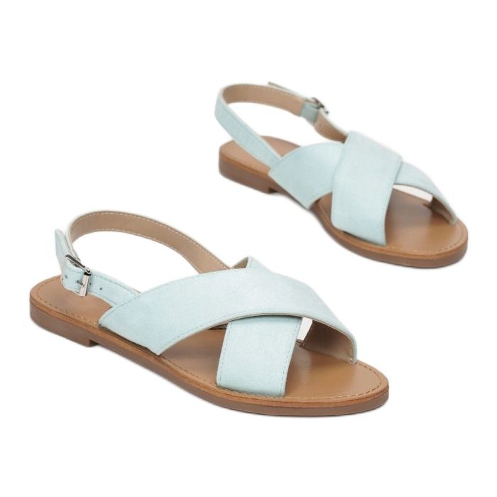 Sandały wyposażone są w zapięcie na sprzączkę wysoko nad kostką, co pozwala na idealne dopasowanie do stopy oraz zapewnia komfort noszenia. Odkryte palce i pięta nadają im lekkości, a zaokrąglony nosek dodatkowo podkreśla ich elegancki charakter. Skrzyżowane paski wykonane z ekozamszu gwarantują nie tylko modny wygląd, ale także odpowiednie wsparcie dla stopy.