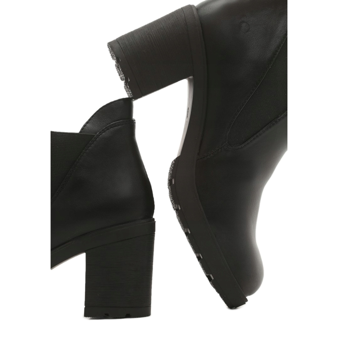Cholewka botków wykonana jest z wysokiej jakości skóry ekologicznej, co sprawia, że są to buty przyjazne dla środowiska. Dzięki elastycznym wstawkom po obu stronach cholewki, zakładanie i zdejmowanie ich staje się szybkie i łatwe, co doceni każda zabiegana kobieta. Dodatkowym atutem jest lekkie ocieplenie, które zapewnia komfort i ciepło w chłodniejsze dni.