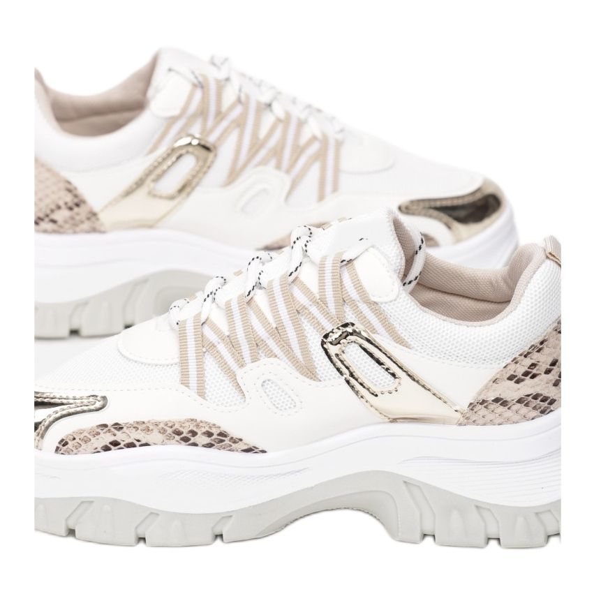 Sneakersy Vices 8540-42 w beżowym kolorze to idealny wybór dla kobiet ceniących sobie wygodę oraz modny wygląd. Te sznurowane buty sportowe wyróżniają się grubą, dwukolorową podeszwą, która dodaje charakteru i stabilności. Cholewka wykonana z ekoskóry oraz materiału tekstylnego została ozdobiona stylową imitacją skóry węża, co sprawia, że te sneakersy stają się wyjątkowym elementem każdej stylizacji.
