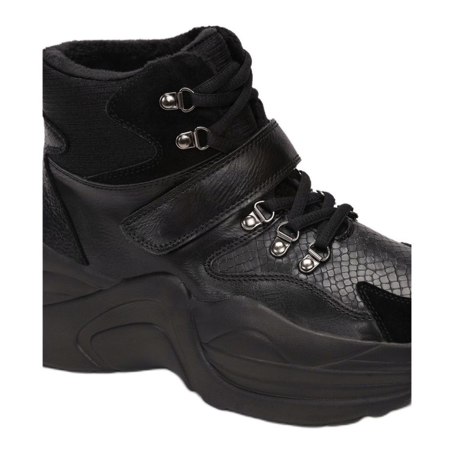 Traperki Vices 8599-38 w kolorze czarnym to idealny wybór dla kobiet, które cenią sobie komfort i modny wygląd. Te wysokie buty sportowe wykonane są z wysokiej jakości eko skóry, co sprawia, że są nie tylko stylowe, ale również przyjazne dla środowiska. Okrągły nosek oraz gruba podeszwa zapewniają nie tylko wygodę, ale także odpowiednią stabilność podczas codziennych aktywności.