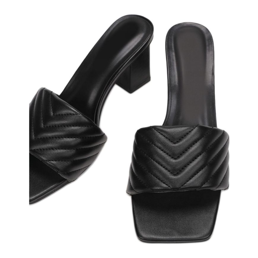 Cechą wyróżniającą model jest szeroki obcas typu słupek o wysokości 7 cm, który zapewnia stabilność podczas chodzenia, a jednocześnie dodaje wdzięku każdej stylizacji. Szeroki pasek przy palcach, zdobiony ukośnym pikowaniem, pięknie komponuje się z elegancką linią klapek, nadając im wyjątkowego charakteru.