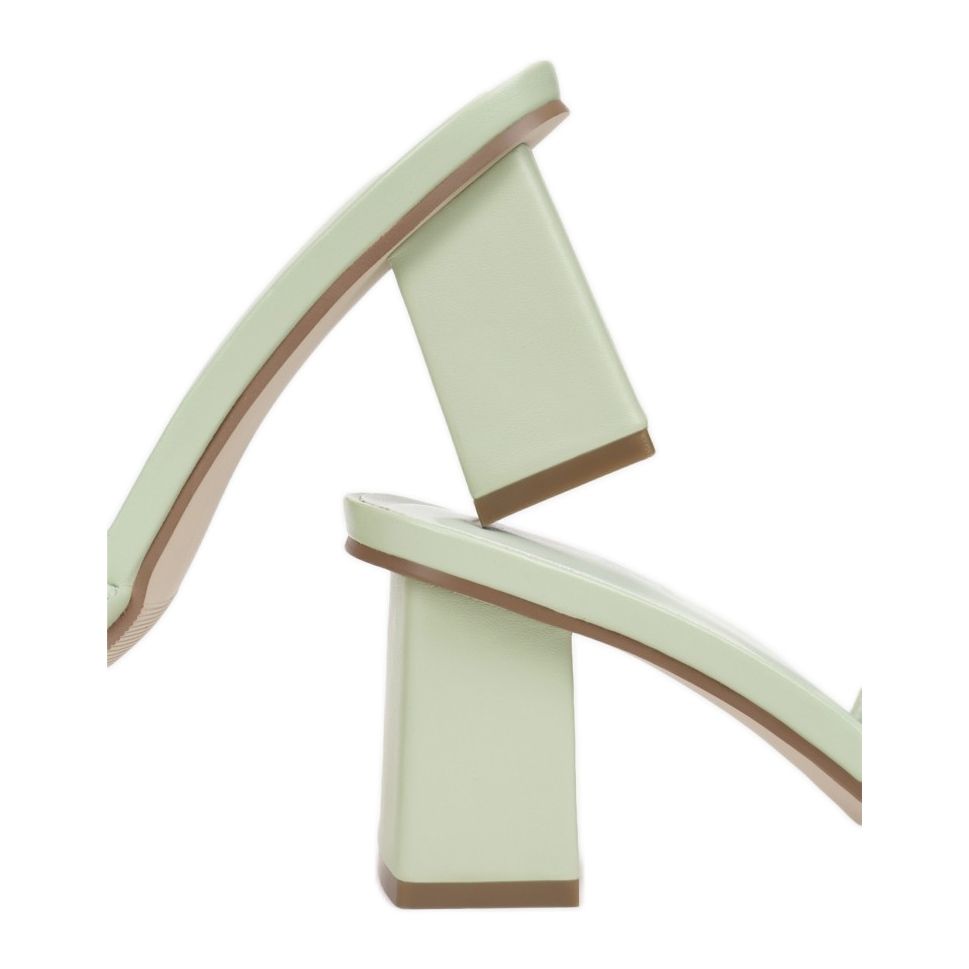 Oto klapki Vices 96018-4-61 w zielonym kolorze, które doskonale łączą wygodę z nowoczesnym stylem. Te eleganckie klapki na szerokim obcasie typu słupek, o wysokości 7 cm, zapewniają stabilność podczas chodzenia, a ich otwarty, kwadratowy nosek nadaje im lekkości i elegancji.