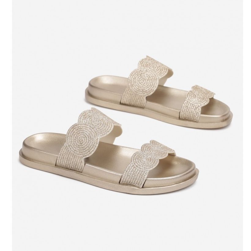 Przedstawiamy klapki wsuwane Vices GJ-3-60-gold, które połączą wygodę z modnym stylem! Te wyjątkowe klapki, utrzymane w eleganckim złotym kolorze, przyciągają wzrok swoją niebanalną formą oraz efektownymi, falowanymi paskami ozdobionymi brokatem. Dzięki odsłoniętemu noskowi i śródstopiu, stopy mogą oddychać, a Ty poczujesz się w nich swobodnie przez cały dzień.