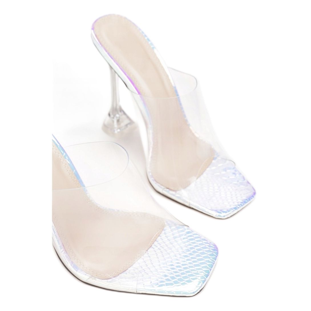 Te klapki charakteryzują się zaokrąglonym noskiem oraz odkrytymi palcami, co pozwala na swobodne oddychanie stopy i odkrycie eleganckiego manicure. Transparentny, silikonowy pasek doskonale dopasowuje się do stopy, a metaliczna wkładka ozdobiona tłoczeniem w kształcie rybich łusek dodaje im unikalnego charakteru.