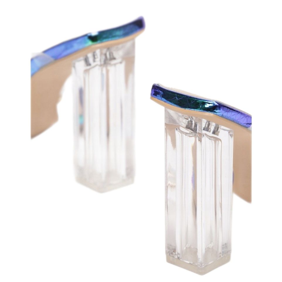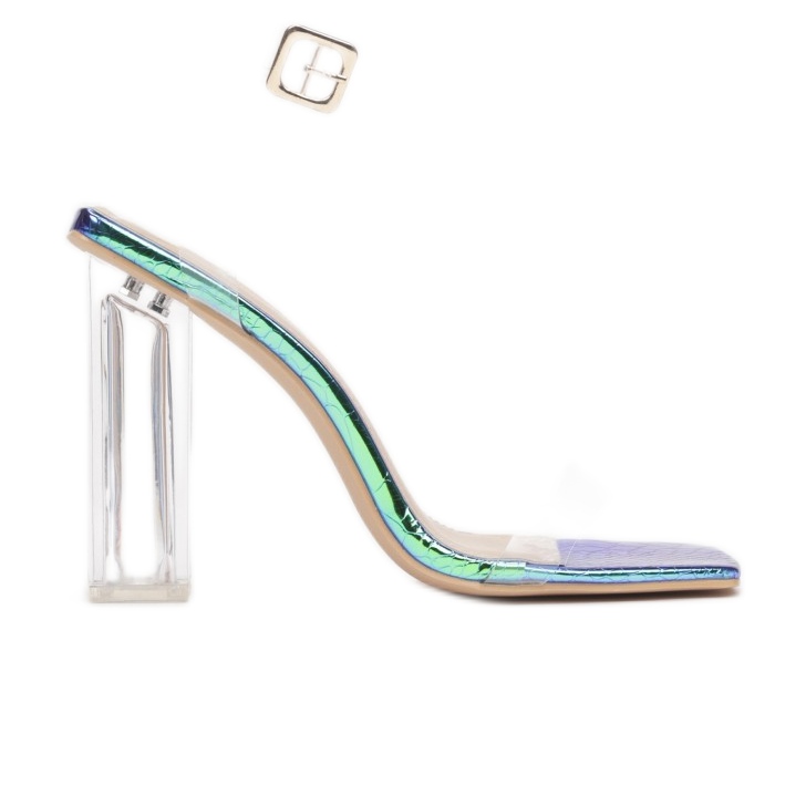 Kunsztownie zapinane na klamrę, zapewniają pewne dopasowanie i stabilność, co czyni je doskonałą propozycją na różne okazje. Geometryczny słupek o wysokości 10,5 cm dodaje elegancji, jednocześnie optycznie wydłużając nogi. Odsłonięty, kwadratowy nosek podkreśla nowoczesny charakter tych butów.