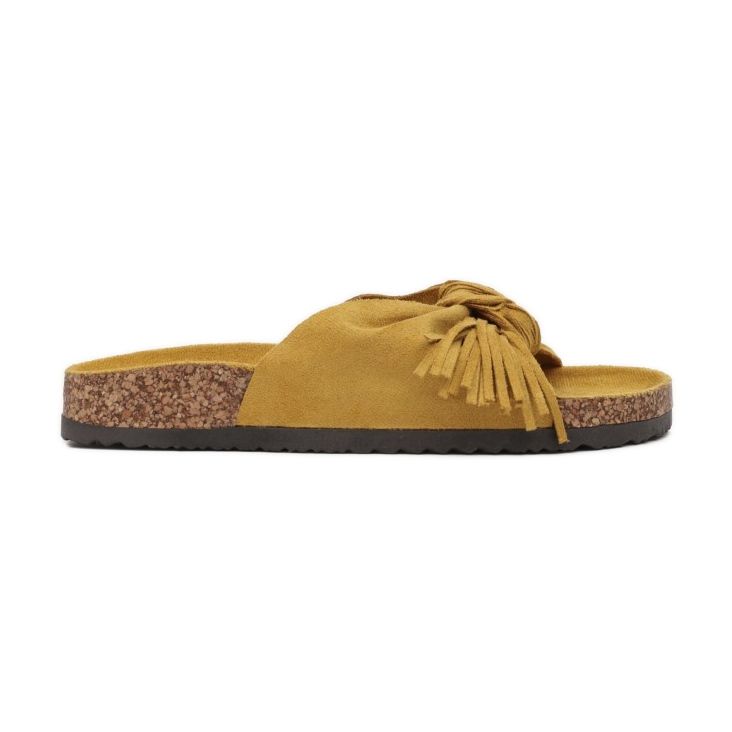 Szeroki pasek przy palcach, przewiązany dopasowanym paskiem z ozdobnymi frędzlami, przyciąga wzrok i nadaje klapkom niepowtarzalnego charakteru. Wykonane z wysokiej jakości ekozamszu, klapki łączą w sobie elegancję i praktyczność, a ich syntetyczna podeszwa gwarantuje trwałość i wygodę przez cały dzień.