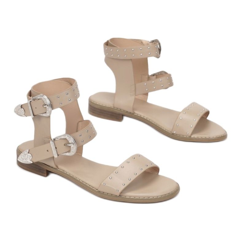 Design sandałów zachwyca szerokimi paskami przy palcach i kostce, które są ozdobione nitemi oraz efektownymi klamrami, dodającymi im stylowego wykończenia. Wykonanie z wysokiej jakości ekoskóry zarówno cholewki, jak i wkładki, zapewnia trwałość oraz łatwość w pielęgnacji, co czyni je praktycznym rozwiązaniem na co dzień.