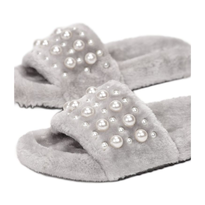Model MULANKA-2177-39 jest ozdobiony subtelnym futerkiem, które dodaje im przytulności oraz elegancji. Dodatkowo, klapki zdobione są perłami, co nadaje im unikalnego charakteru, idealnego do różnorodnych stylizacji. Szary kolor sprawia, że będą pasowały do wielu zestawów, zarówno tych bardziej casualowych, jak i eleganckich.