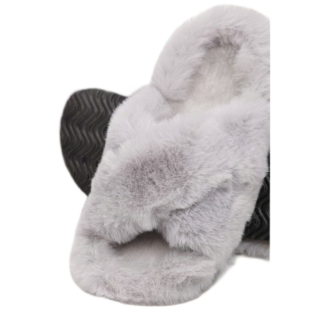 Model jest wsuwany, co sprawia, że zakładanie i zdejmowanie ich jest bardzo proste i szybkie. Stabilizujące, skrzyżowane paski przy palcach nie tylko urzekają swoim wyglądem, ale także gwarantują dobrą stabilność stopy. Wykonane z materiału imitującego futerko, klapki te przyjemnie otulają stopy, zapewniając im ciepło i komfort, idealne na wieczorne chwile relaksu w domowym zaciszu.