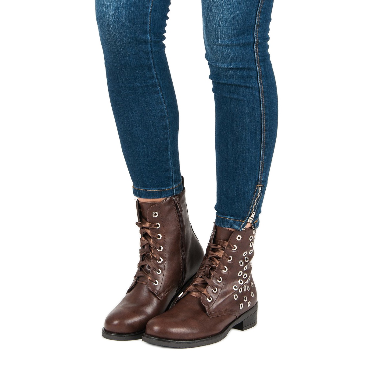 Brązowe workery wyposażone są w mocne, brązowe sznurówki i efektowny boczny zamek, które nie tylko podkreślają ich nowoczesny charakter, ale również ułatwiają zakładanie. Dodatkowe zdobienia w postaci dżetów nadają im rockowego klimatu, idealnego do casualowych stylizacji.