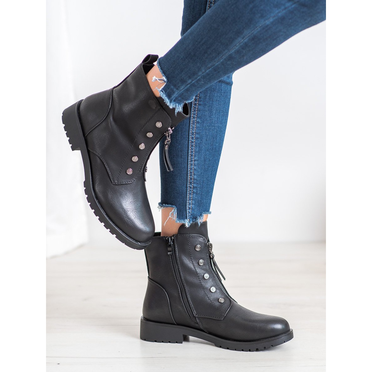 Wysokość cholewki wynosząca 13-14 cm oraz zapięcie na zamek ułatwiają zakładanie butów, a ocieplenie wewnętrzne sprawia, że stopy pozostaną ciepłe nawet w najbardziej chłodne dni. Płaski obcas o wysokości 3,5 cm sprawia, że botki są wygodne na co dzień, umożliwiając długie spacery bez obaw o niewygodę.