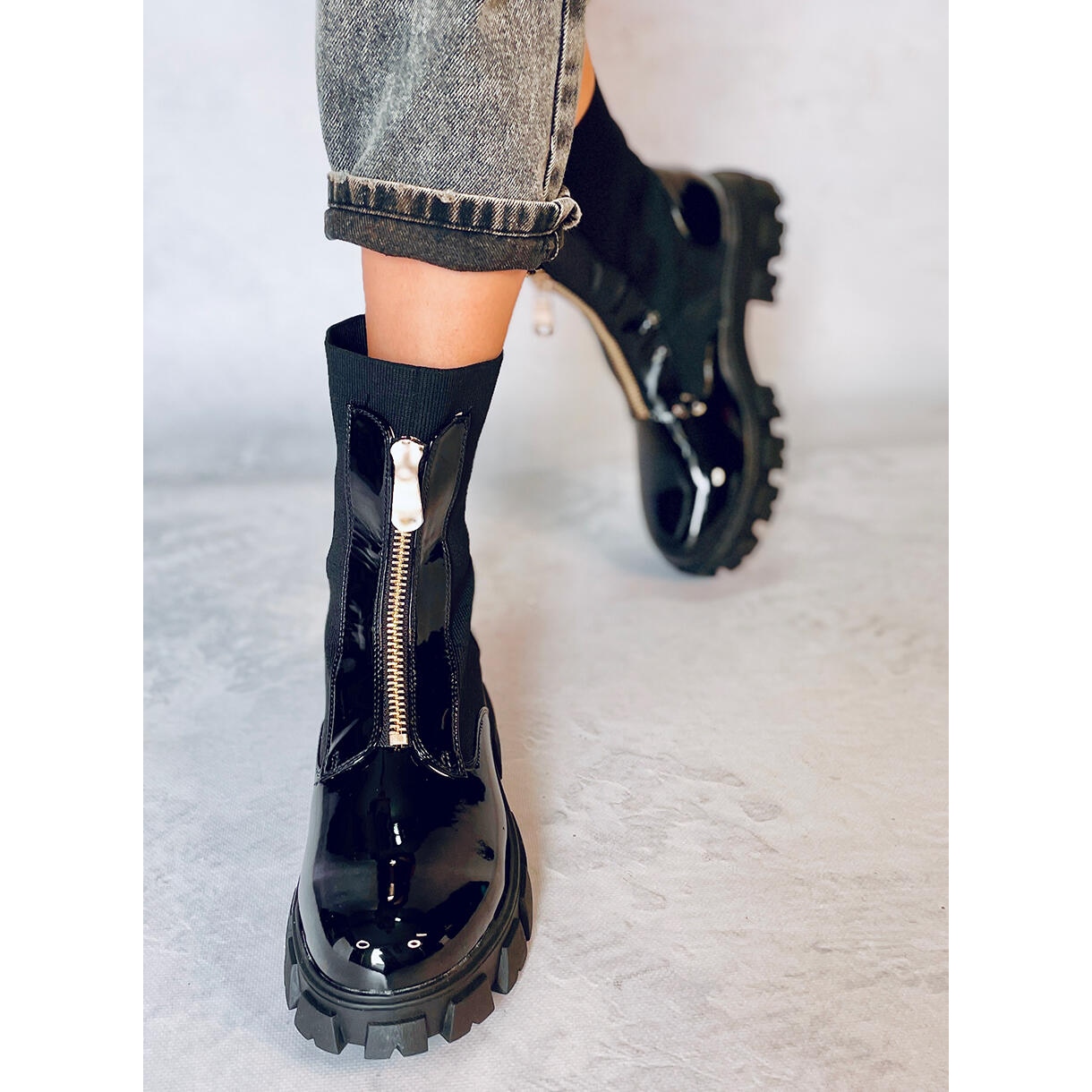 Czarny kolor z lakierowanym wykończeniem podkreśla ich ekstrawagancki charakter, a ozdobny zamek z przodu nadaje im militarnego, ale zarazem kobiecego akcentu. Wysoka podeszwa o grubości 5,5 cm nie tylko dodaje wzrostu, ale również zapewnia wygodę podczas codziennych aktywności. Dzięki okrągłemu noskowi i płaskiemu obcasowi, workery te gwarantują komfort noszenia przez cały dzień.