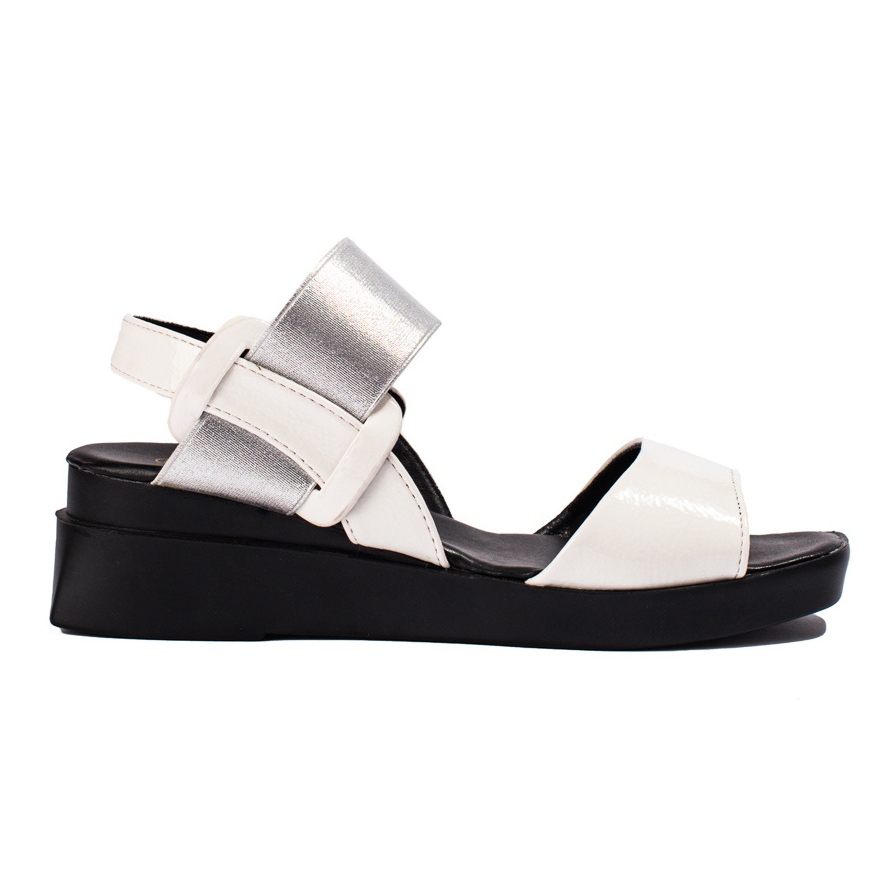 Wysoka platforma o wysokości 6 cm dodaje subtelnego wdzięku każdej stylizacji, a ich minimalistyczny, biały kolor w połączeniu z srebrnymi akcentami sprawia, że sandały będą doskonałym uzupełnieniem zarówno codziennych, jak i bardziej eleganckich outfitów. Zapięcie na gumkę ułatwia zakładanie i zdejmowanie, co jest dodatkowym atutem w codziennym użytkowaniu.