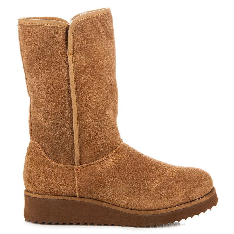 Mukluki mają wsuwane zapięcie, co ułatwia zakładanie i zdejchanie butów, a ich wysokość sprawia, że skutecznie chronią nogi przed zimnem. Dodatkowo ocieplenie wewnątrz buta zapewnia przyjemne ciepło, podczas gdy 3,5 cm platforma nadaje im subtelnej elegancji. Dominujący brązowy kolor z beżowym akcentem sprawdzi się w wielu stylizacjach, zarówno casualowych, jak i bardziej eleganckich.