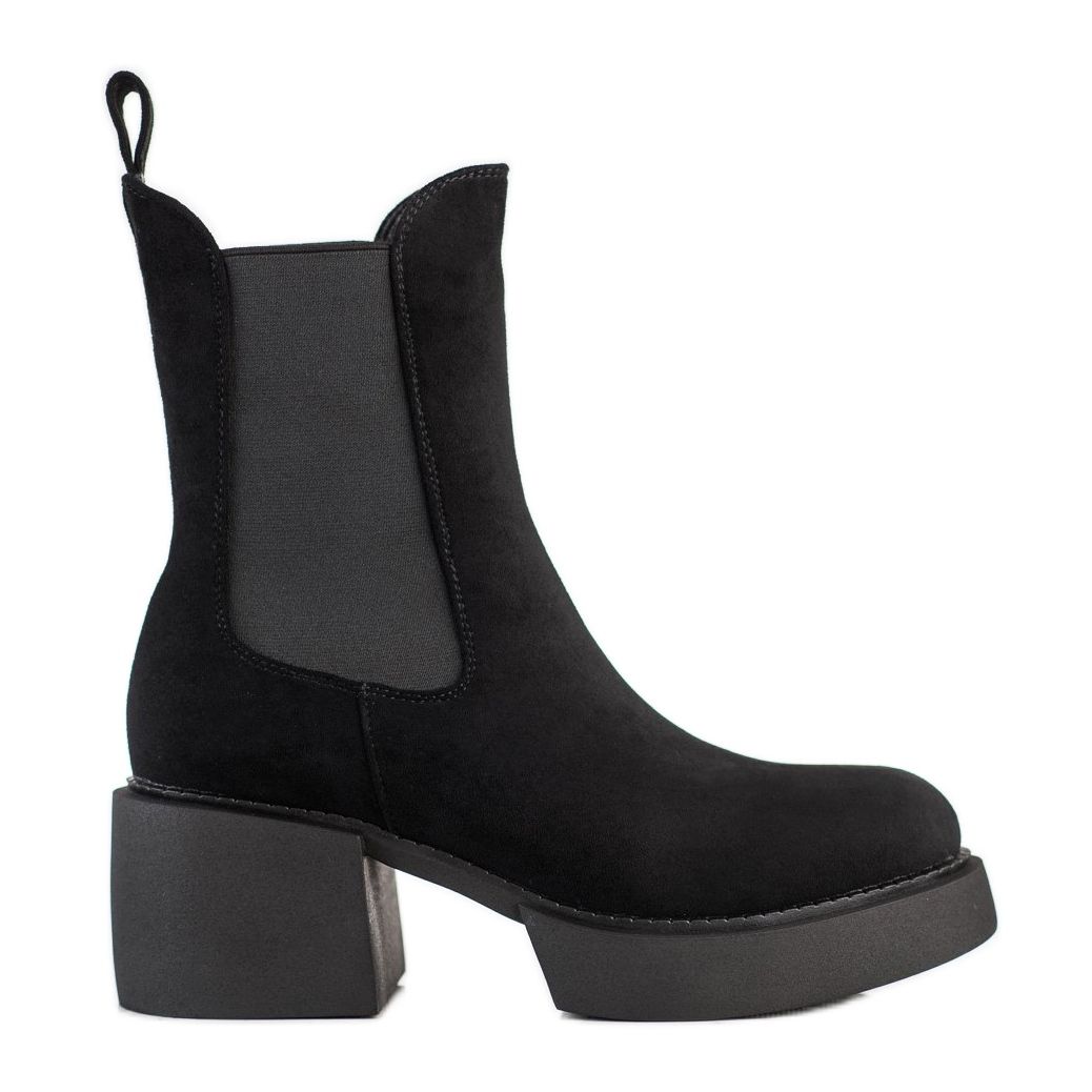 Wysoka cholewka, która sięga za kostkę, została wykonana z ekologicznej skóry imitującej zamsz, co nadaje butom szykownego wyglądu. Miękki, zabudowany zapiętek oraz tekstylne wnętrze zapewniają komfort noszenia i dopasowanie do stopy. Dodatkowo, obcas w kształcie słupka o wysokości 6,5 cm oraz platforma o wysokości 2 cm zapewniają stabilność oraz lekkość kroku.