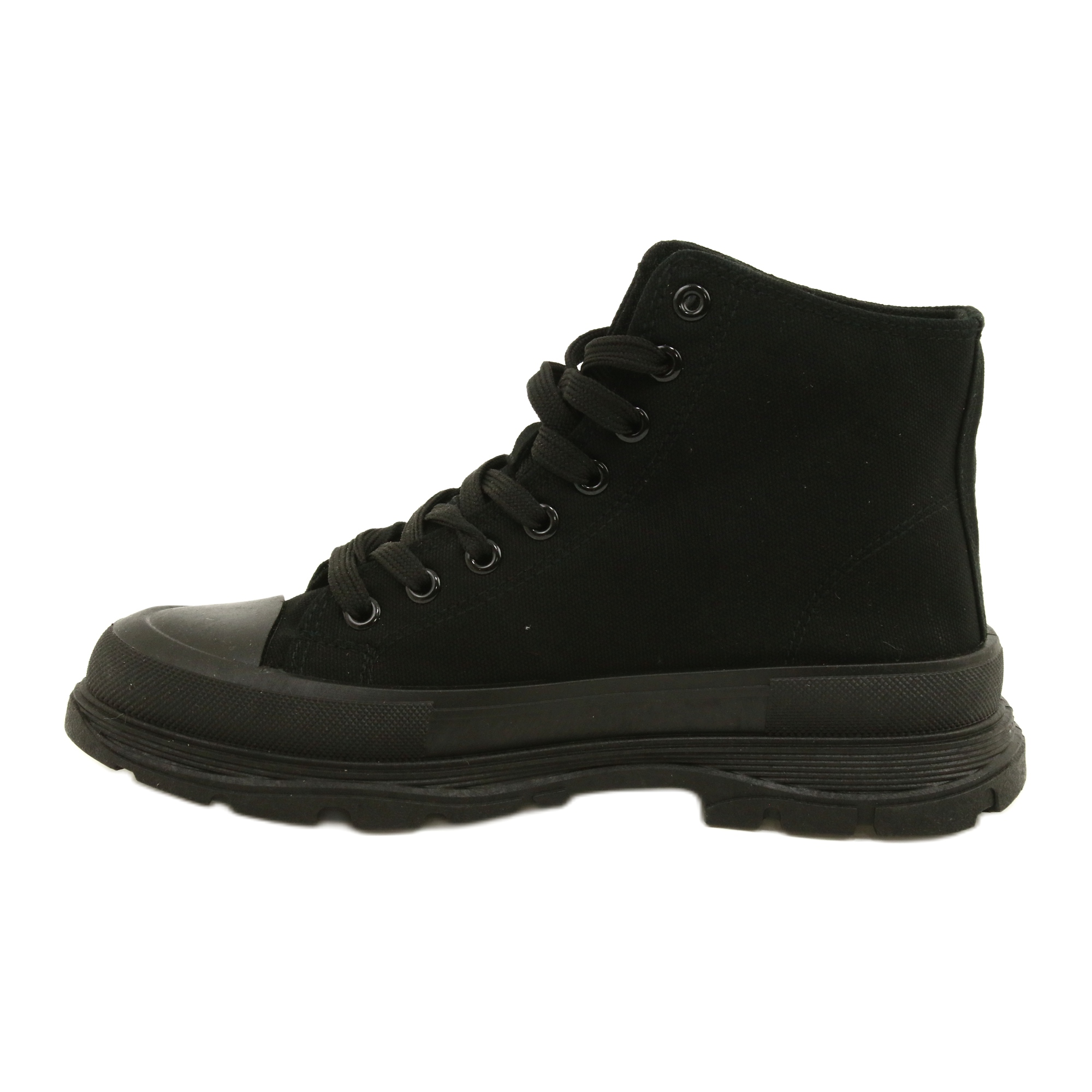 Eleganckie, czarne trampki damskie News 21SP02-1050 łączą miejską estetykę z komfortem użytkowania. Wysoka cholewka sięgająca za kostkę nadaje butom wyrazisty, modny charakter, a 4 cm platforma subtelnie podnosi sylwetkę, nie rezygnując z wygody.