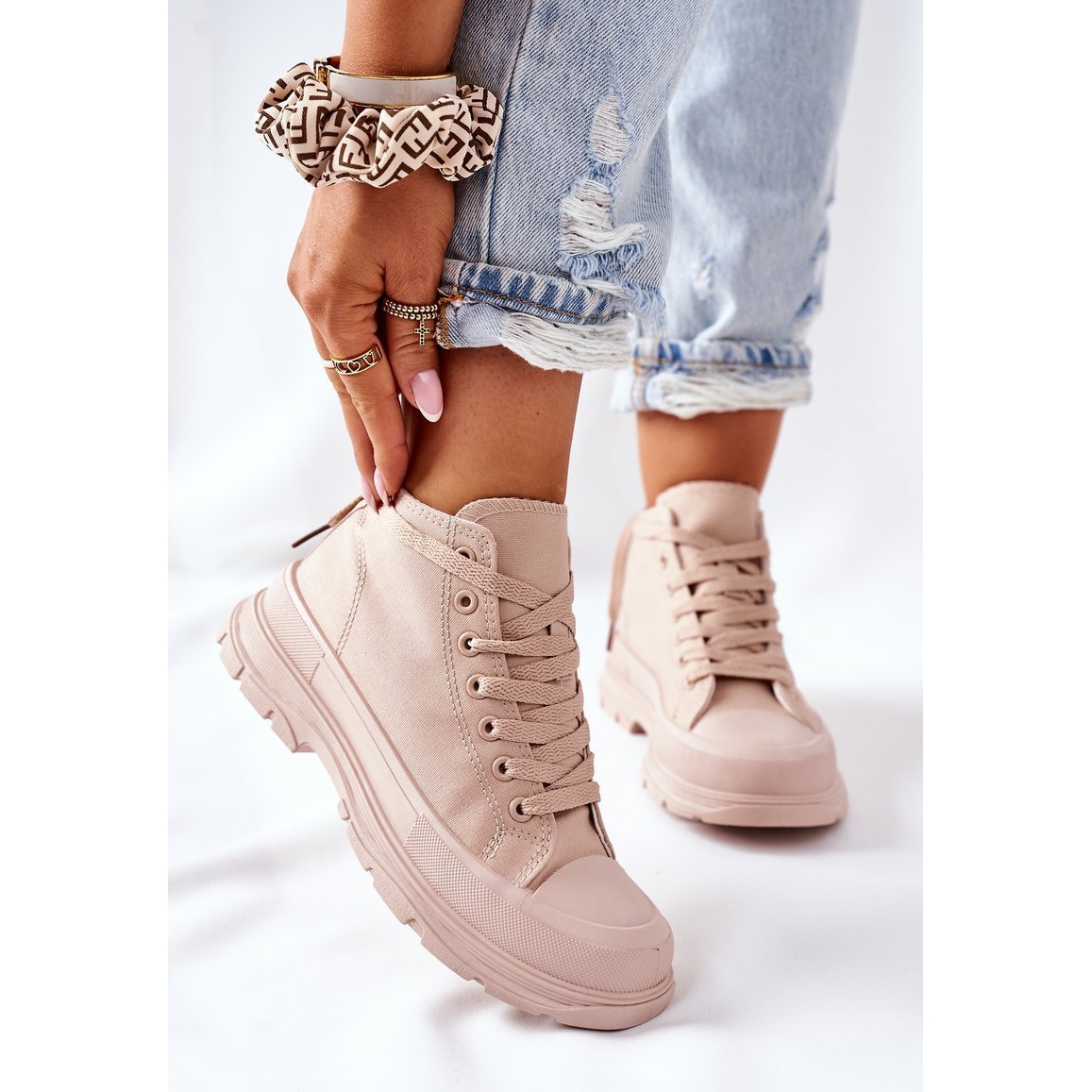 Szczegóły: FJ1 Wysokie Trampki Na Dużej Podeszwie Beżowe Trissy beżowy