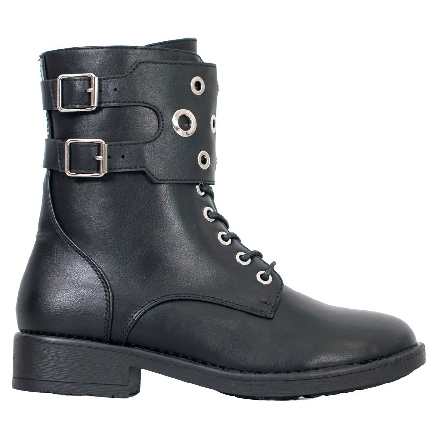 Wysokie cholewki, sięgające za kostkę, skutecznie zabezpieczają stopy przed zimnem i wilgocią, co czyni je doskonałym wyborem na chłodniejsze dni. Solidna podeszwa z bieżnikiem gwarantuje stabilność, a zarazem wygodę podczas chodzenia. Dodatkowym atutem są dżety oraz ozdobne sprzączki, które nadają butom rockowego charakteru i sprawiają, że stają się one modowym must-have w każdej garderobie.