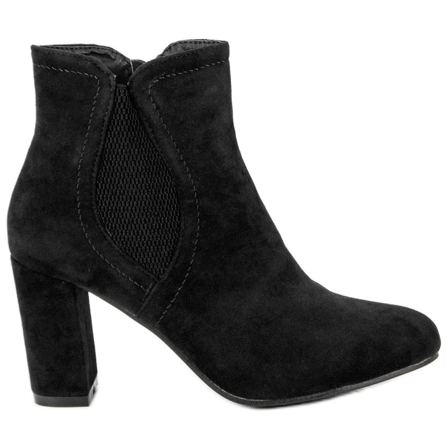 Czarne zamszowe botki na słupku to idealny wybór dla każdej kobiety, która pragnie dodać swojemu stylowi elegancji i szyku. Wykonane z wysokiej jakości, miłego w dotyku zamszu, te buty łączą w sobie komfort i modny design, stając się niezastąpionym elementem jesienno-zimowej garderoby.