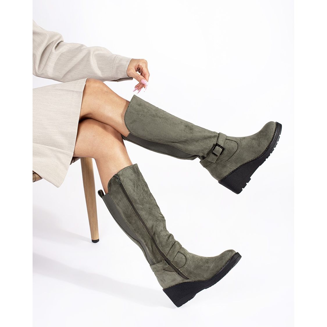 - Model: Zamszowe ciemnozielone kozaki na koturnie