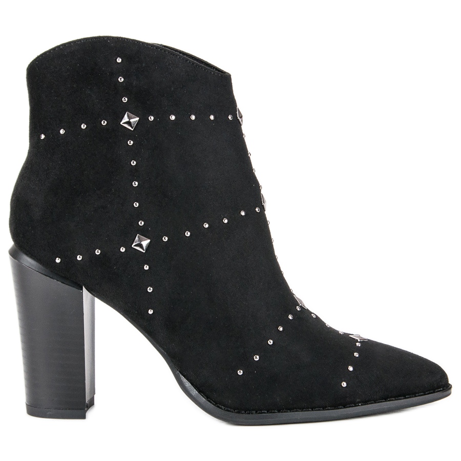 Dzięki wysokiemu obcasowi w formie słupka o wysokości 9,5 cm, podkreślają sylwetkę i nadają każdej stylizacji elegancki wygląd. Spiczasty nosek oraz oryginalne zdobienia dżetami i ćwiekami wprowadzają odrobinę zadziorności, czyniąc te botki wyjątkowymi. Dodatkowo, zapięcie na zamek ułatwia zakładanie i zdejmowanie, a zabudowany zapiętek zapewnia stabilność podczas noszenia.