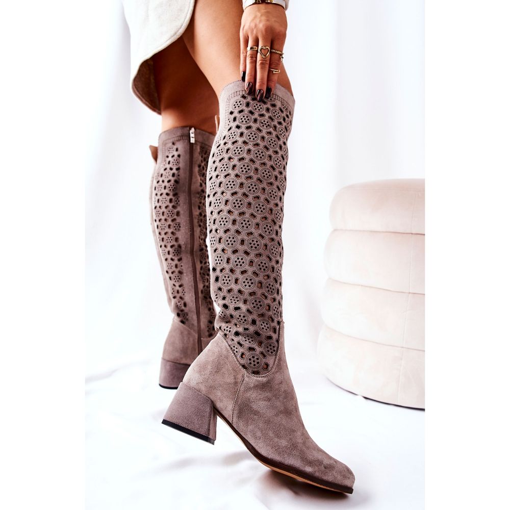Szczegóły: PA2 Zamszowe Kozaki Z Ażurowym Wzorem Jasnobrązowe Hekilea