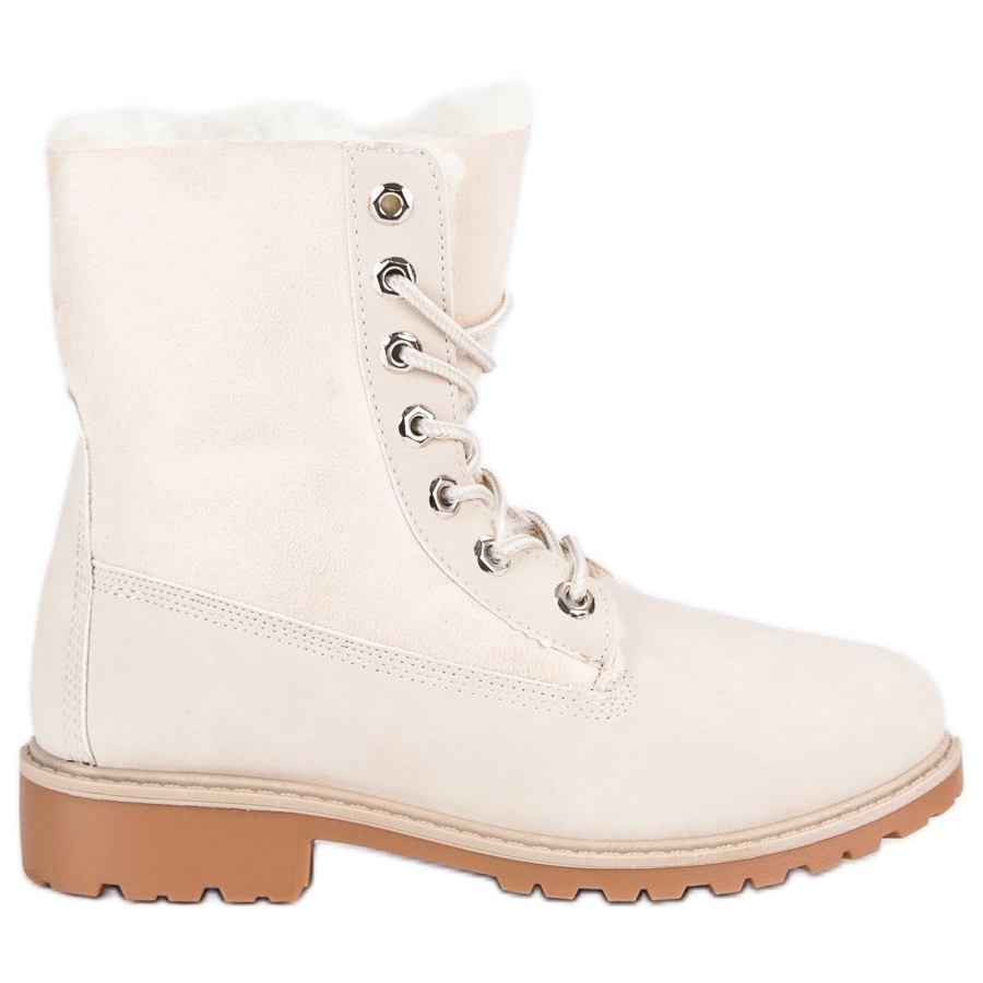 Zamszowe traperki są sznurowane, co pozwala na dopasowanie ich do indywidualnych potrzeb, a płaski obcas o wysokości 3 cm zapewnia wygodę i stabilność przy każdym kroku. Wnętrze butów ocieplone jest miękkim futerkiem, co czyni je idealnym wyborem na chłodniejsze dni jesieni i zimy.