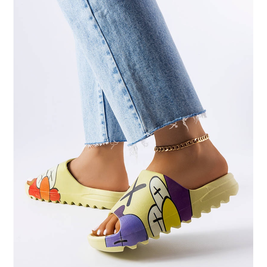 Klapki są wsuwane, co ułatwia zakładanie i zdejmowanie, a ich wysokość podeszwy wynosi 4 cm, co dodaje subtelnego podwyższenia. Damskie klapki nie mają noska, co wpływa na ich lekkość i przewiewność, idealną na gorące dni.